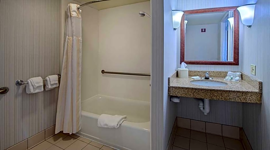 This mobility accessible standard room features one king-sized bed, and an accessible tub. This room offers the latest in technology and ergonomic comfort to our guests. Grab bar in tub with attached accessible seating, lowered vanity in bathroom, and lowered shelf in closet. And the pursuit of the perfect night's stay continues with an evolution of innovative new amenities including the bed, chair, television and crisp white duvet. The ergonomic chair is good for your back and better for work. Enjoy an in-room movie or your favorite television show on our 36-inch HDTV. There's also a microwave, refrigerator and coffee/tea maker to help you feel at home. And for conducting business, our rooms ensure your productivity thanks to the spacious work desk, two telephones with dataport and voicemail and complimentary WiFi. Any corresponding photo may not reflect the specific accessible room type or room feature.